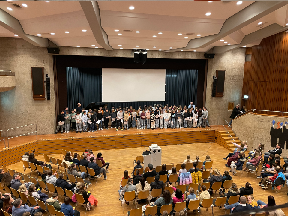 Im Anschluss trafen sich alle im Kulturzentrum zur offiziellen Feier. Mit einem kleinen bunten Begrüßungsprogramm, nämlich einem englischsprachigen Theaterstück und verschiedenen Musikstücken luden mehrere Klassenstufen die Neuankömmlinge herzlich ein, an unserem Schulleben teilzunehmen. Daher konnten auch alle Lieder dank der angezeigten Texte mitsingen.
